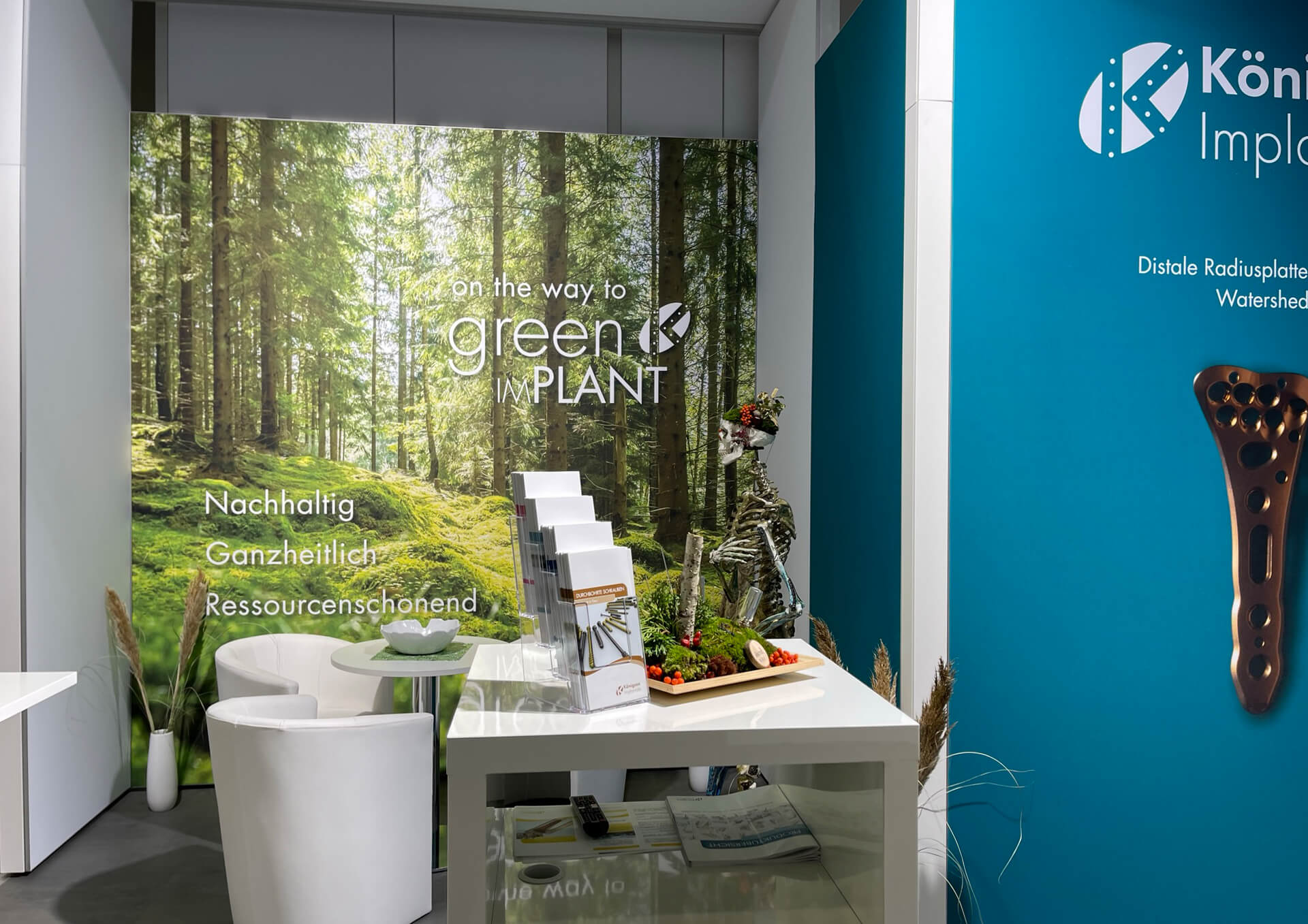 Die Architektur des Messestandes sollte darüber hinaus eine überzeugende Gestaltung von Kontakt- und Präsentationszonen bieten, Möglichkeiten der Bewirtung in einem zentralen Thekenbereich und dementsprechend ein angemessenes Lager, welche logistisch und ergonomisch exakt aufeinander abgestimmt sind. Die Praktikabilität und Nachhaltigkeit musste bei GARREIS und Königsee Implantate gewährleistet sein, da beide Unternehmen durch Wiederverwendbarkeit, Ihre Verantwortung für die Gesellschaft und Umwelt sehr ernst nehmen, das gilt auch für die Nebengewerke Transport, Auf- und Abbau.
