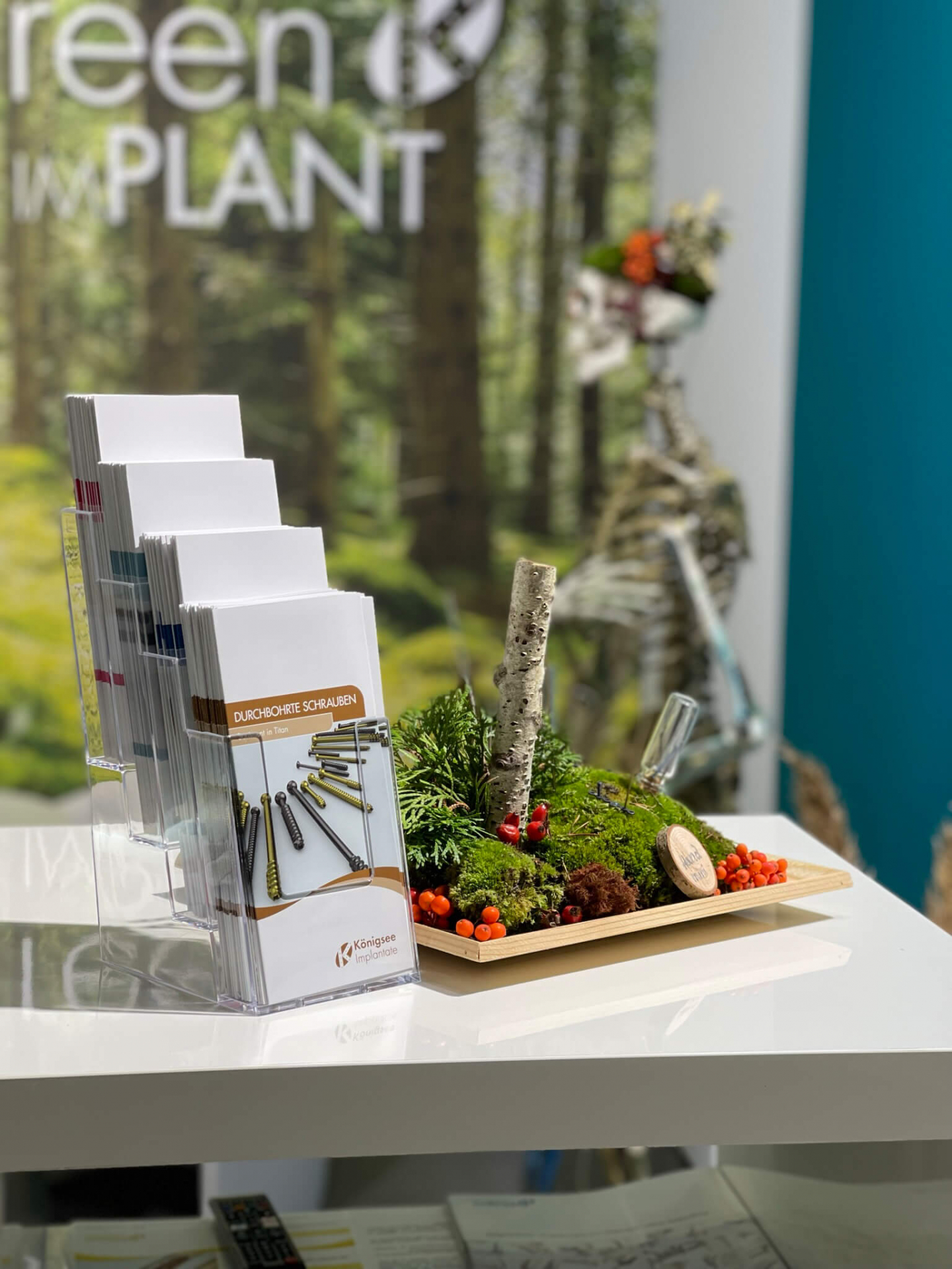 Der Fußboden wurde angehoben und mit Laminat (Design Beton) belegt um einen Raum zu schaffen, in dem der Kunde das Gefühl bekommt, er betritt einen Designraum auf dem er Neuheiten entdecken und ins Gespräch mit den Mitarbeitern der Königsee Implantate GmbH kommen kann. Auf dem Messestand trifft man sich gewissermaßen auf „vertrautem“ Boden – das trägt unter Anderem zu einer guten Atmosphäre für die richtigen Gespräche bei.