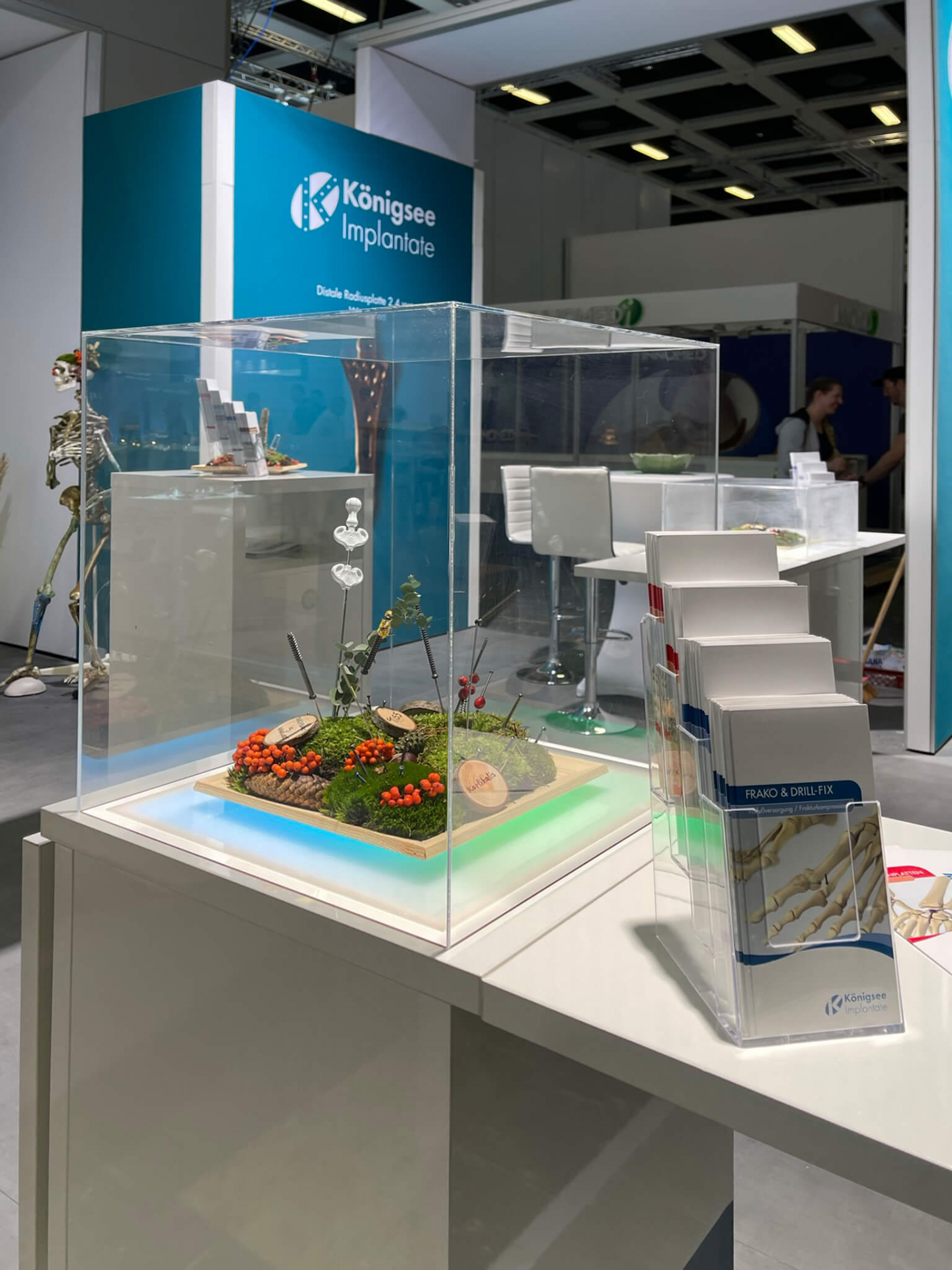 Bei der Konzeption der Messepräsenz für einen der führenden deutschen Medizintechnikunternehmen auf dem Gebiet der Osteosynthese, galt es ein komplett neues Konzept zu entwickeln. Die Königsee Implantate GmbH vertraut seit 2013 auf die GARREIS Messebauabteilung und deren Projektleiter. Zuerst als Kaufstand und damit Eigentum, welcher durch die Modularität über die Jahre immer wieder verändert, kleiner und größer gebaut wurde und jetzt als Mietmessestand eingesetzt wird.