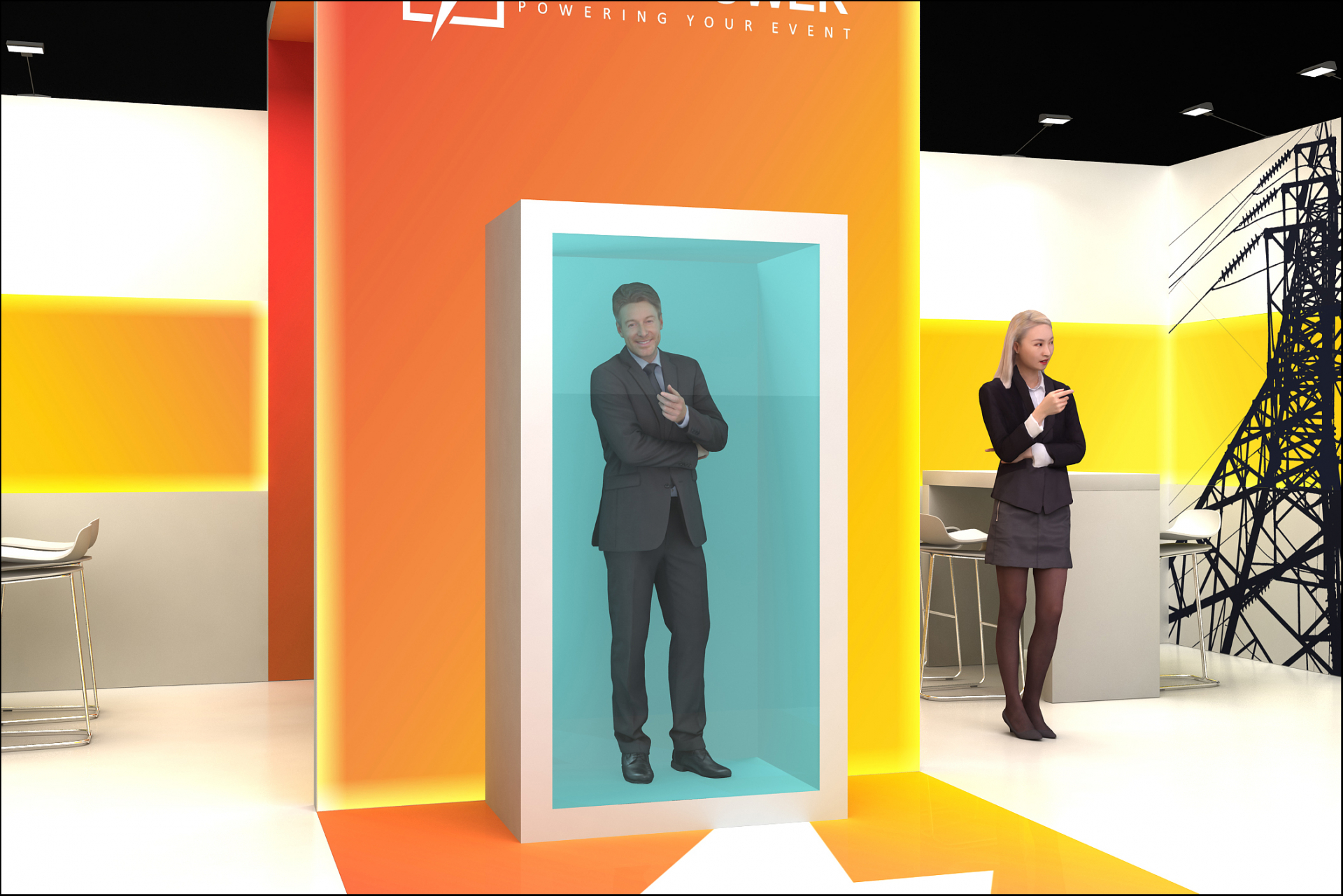 Die Stärke der Holobox liegt vor allem in ihrer Größe. Der gesamte Kasten ist fast 2 Meter hoch. Aufgrund dieser Größe können Sie "lebensechte" Personen darstellen. Und das ist natürlich sehr interessant. Schließlich sind wir als Menschen darauf programmiert, andere Menschen anzuschauen. Es ist darum einfach, durch Menschen, die sich in der Holobox bewegen, die Aufmerksamkeit von Messebesuchern zu erregen.