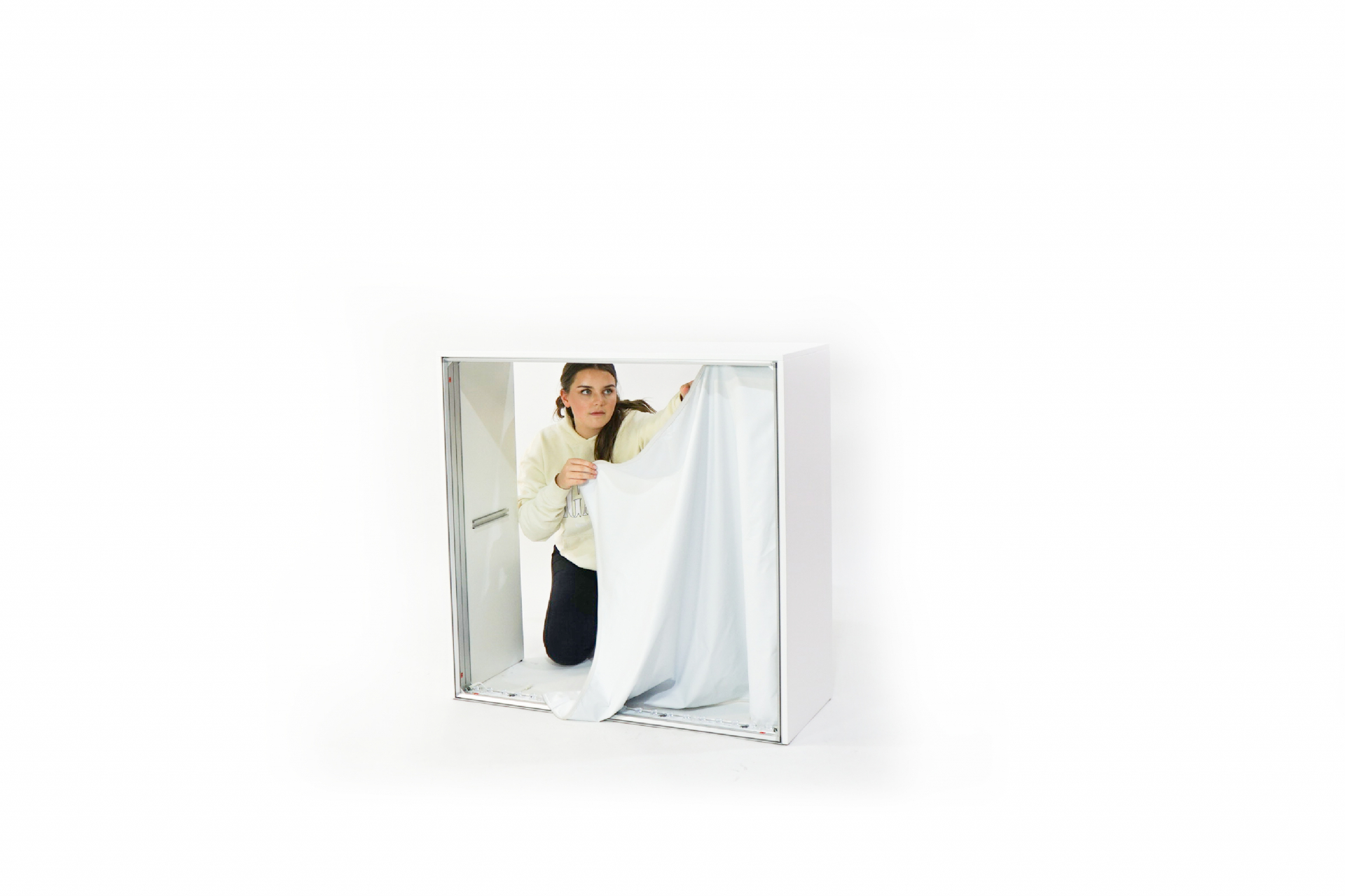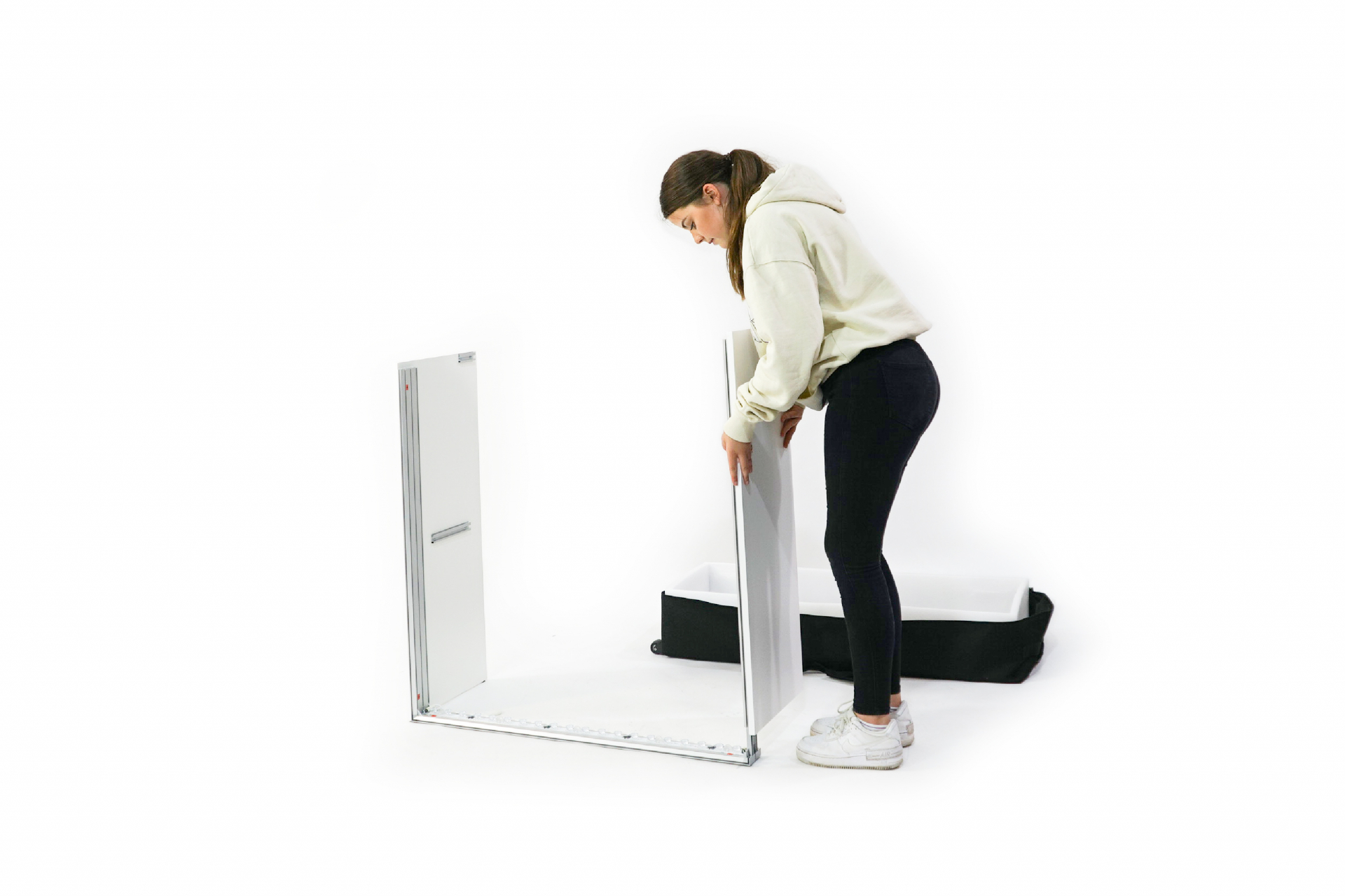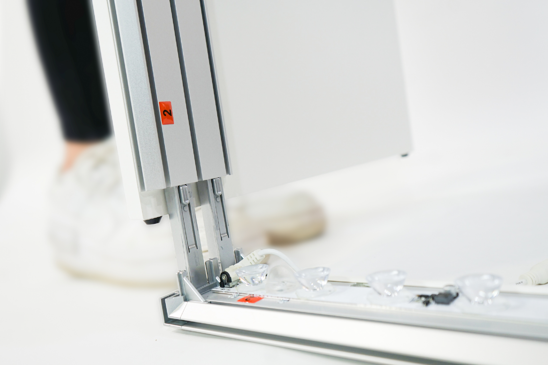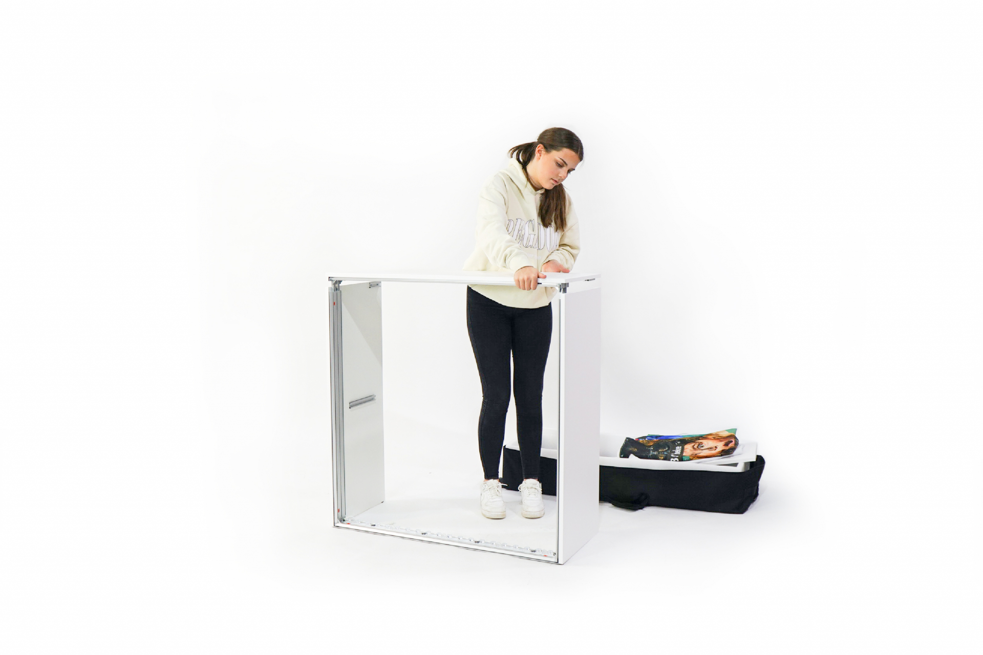 Verbinden Sie die einzelnen Bauteile mit Hilfe des innovativen Stecksystems und montieren Sie Ihre individuell bedruckte Textilgrafik inkl. der lichtdichten Rückseite. Danach hängen Sie den Einlegeboden und - optional - die abschließbaren Türen ein. Nur noch den Stecker einstecken – und Ihre LED-Messetheke erstrahlt in gleichmäßigem Licht.