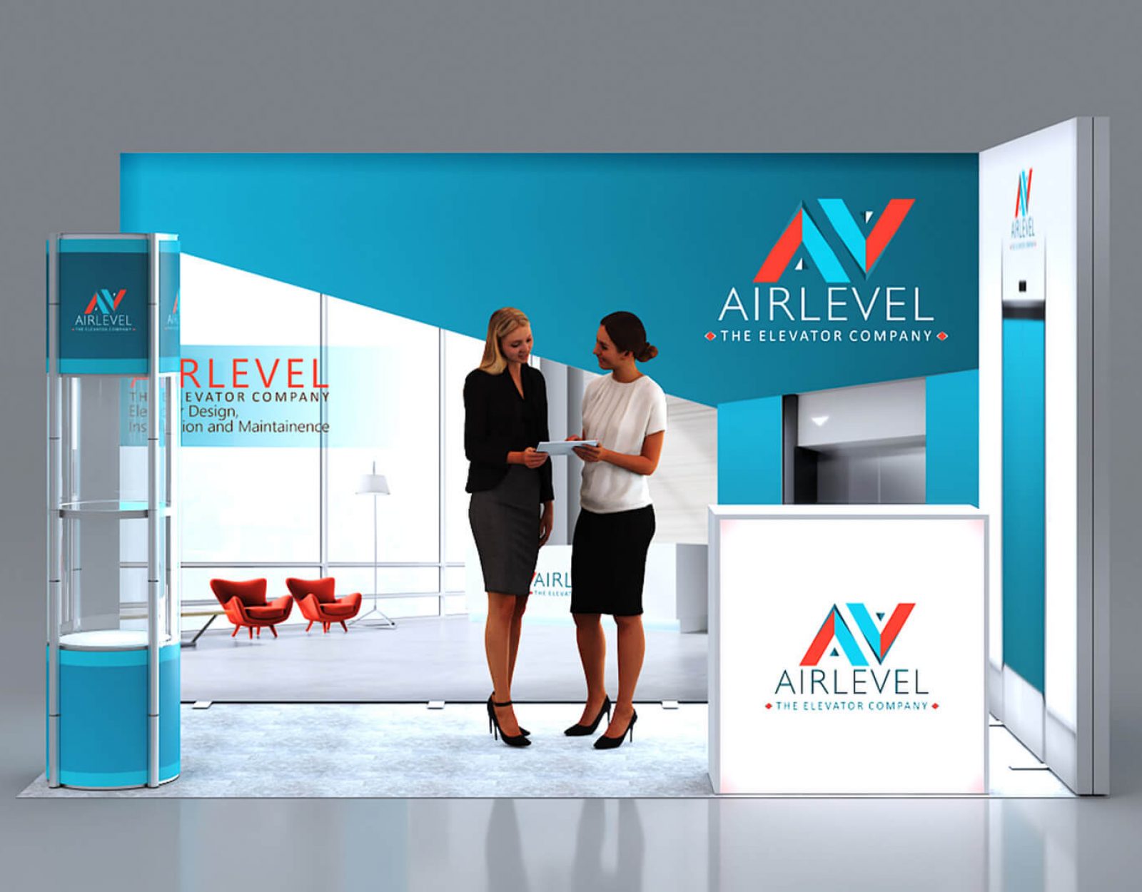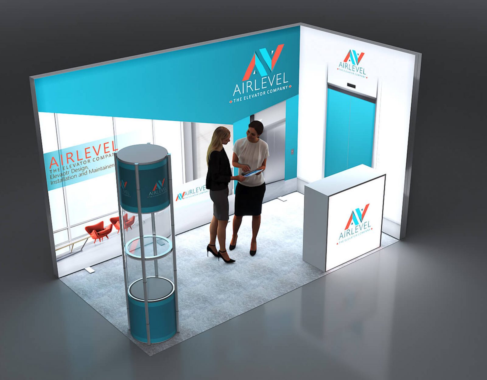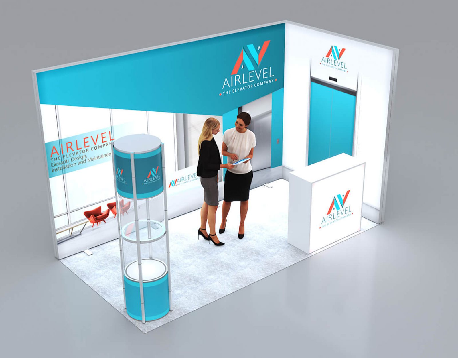 Modulares Messeset 120 4x2-01 LED-Eckstand mit Theke und Vitrine