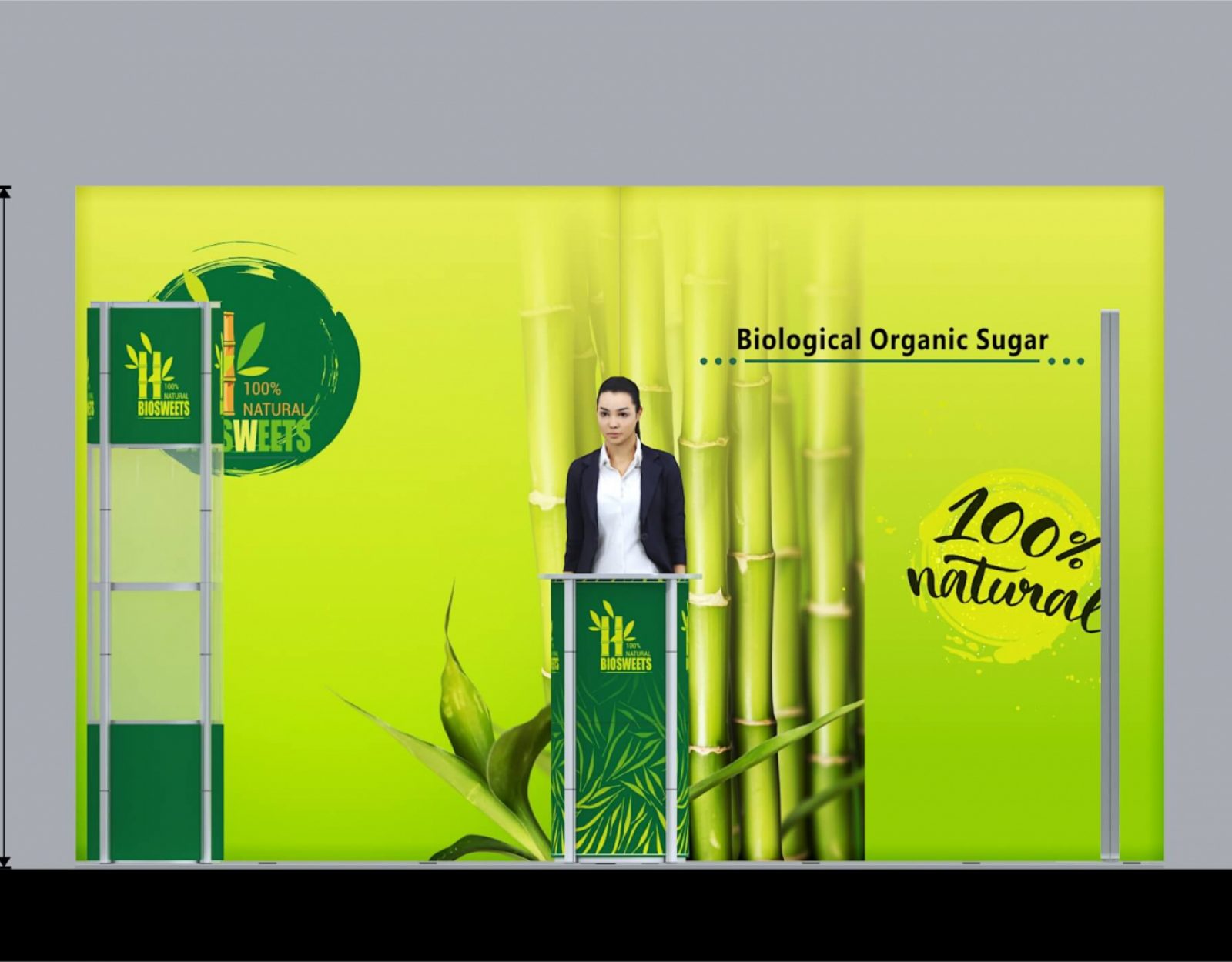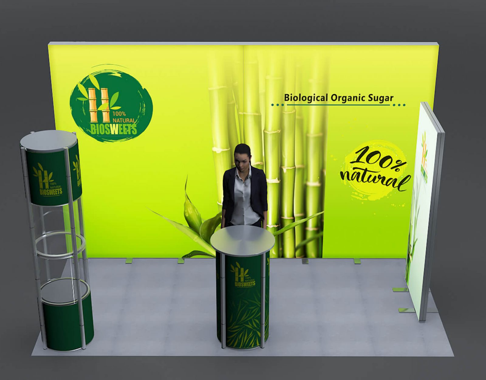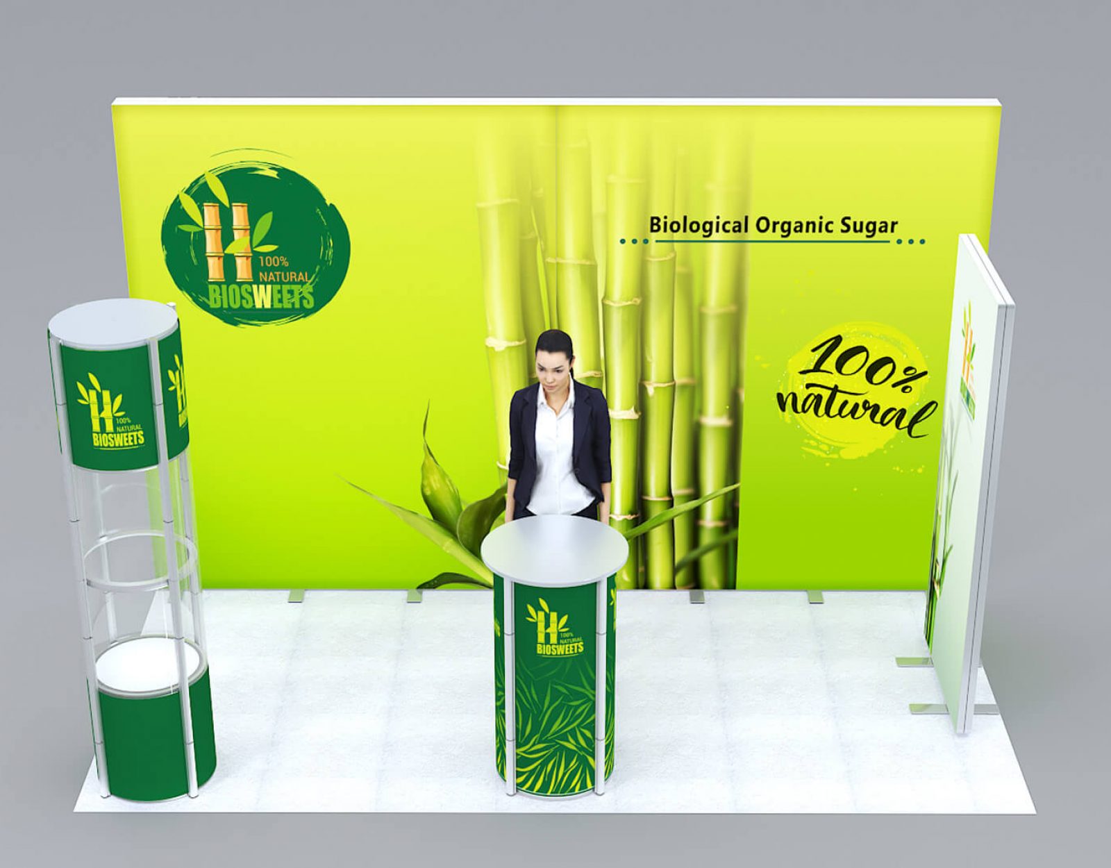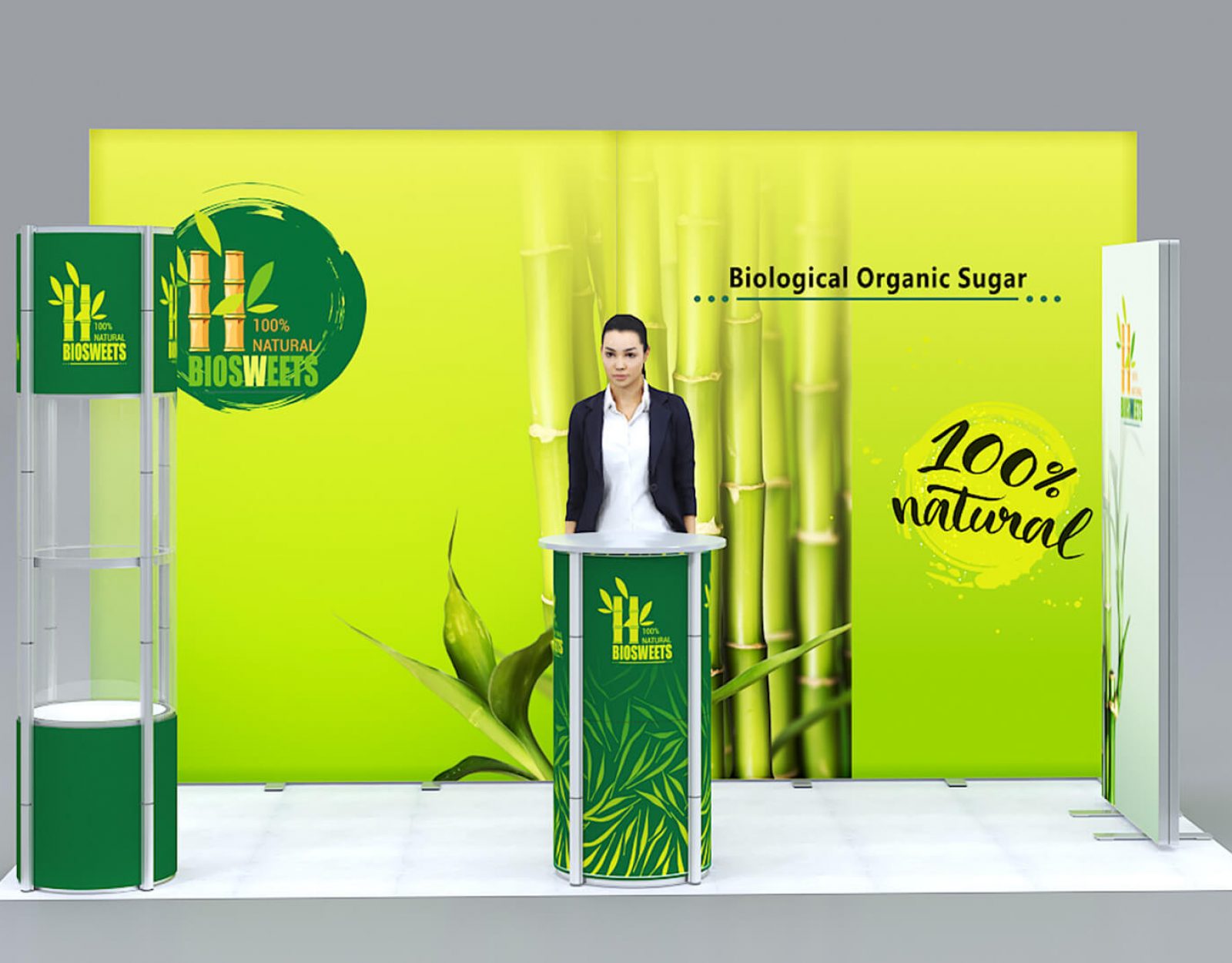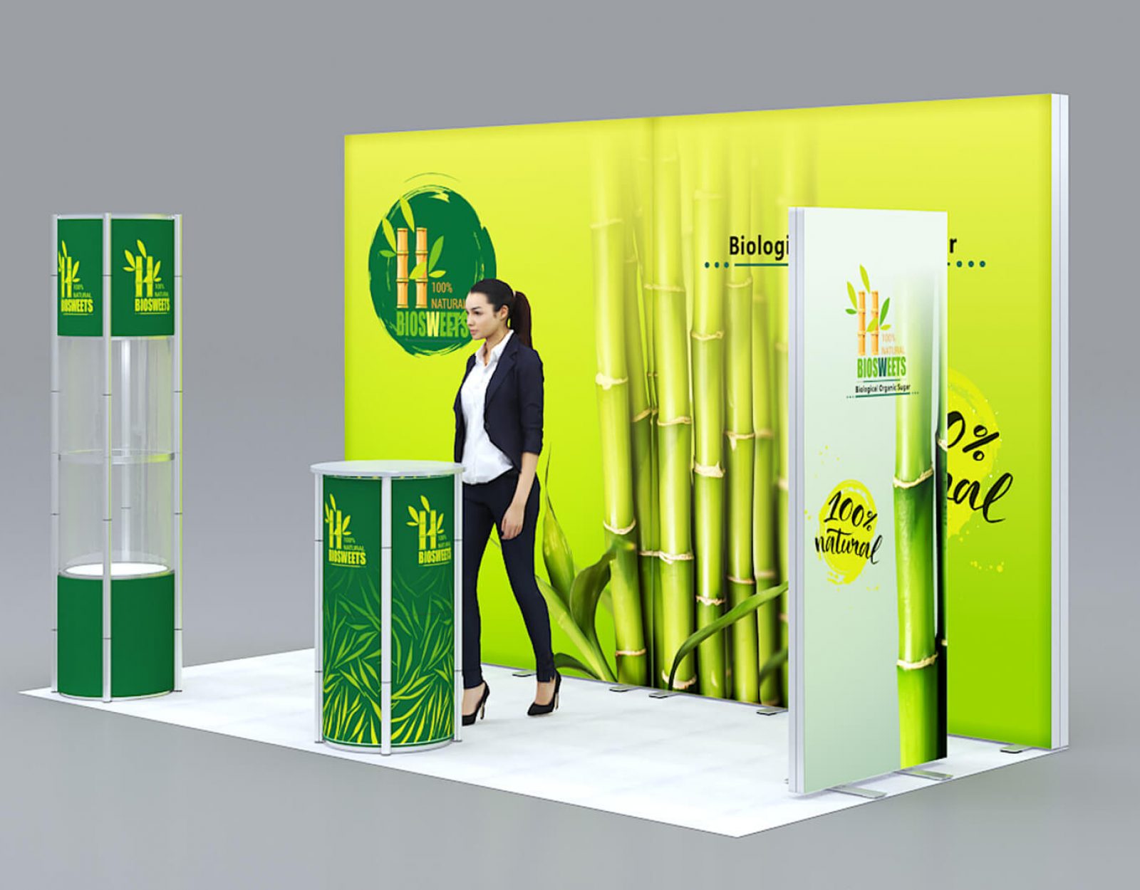 Modulares Messeset 120 4x2-02 LED-Leuchtwand mit Theke und Vitrine