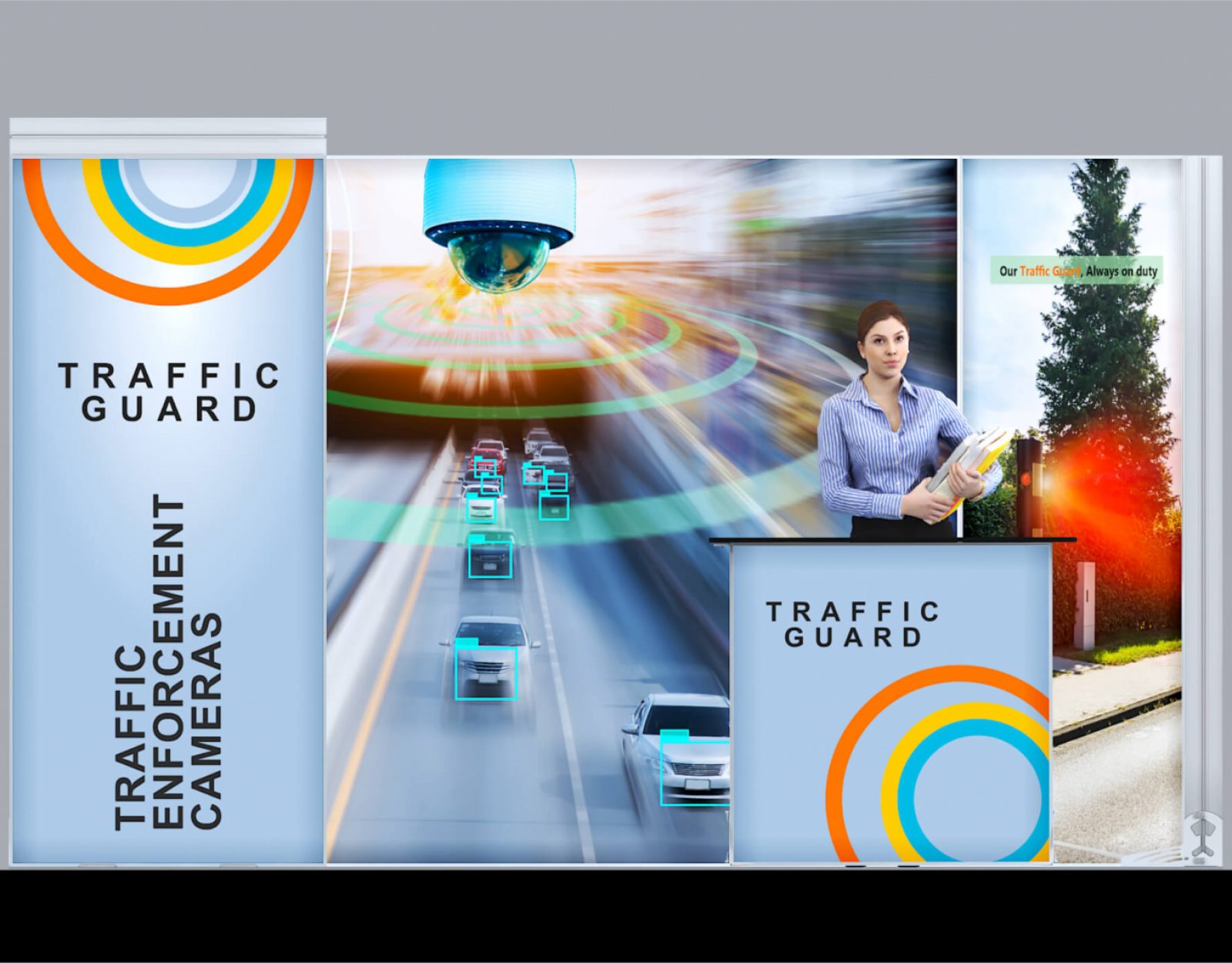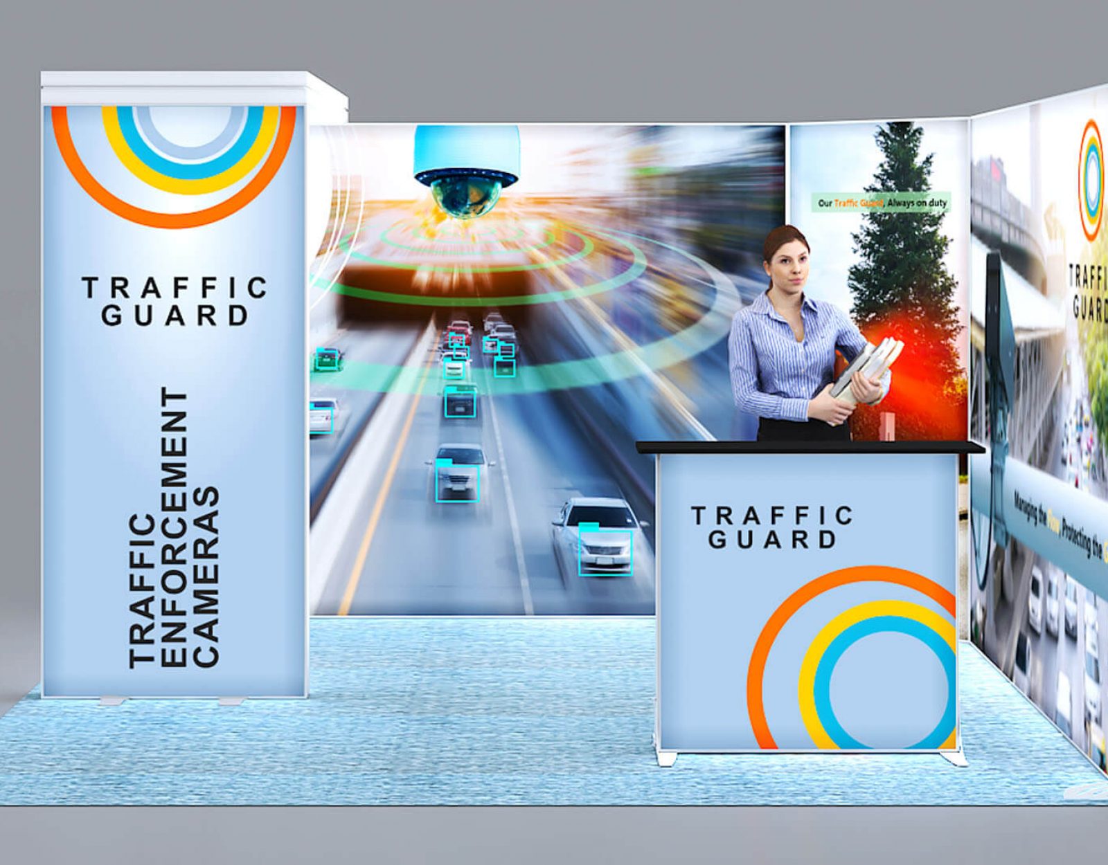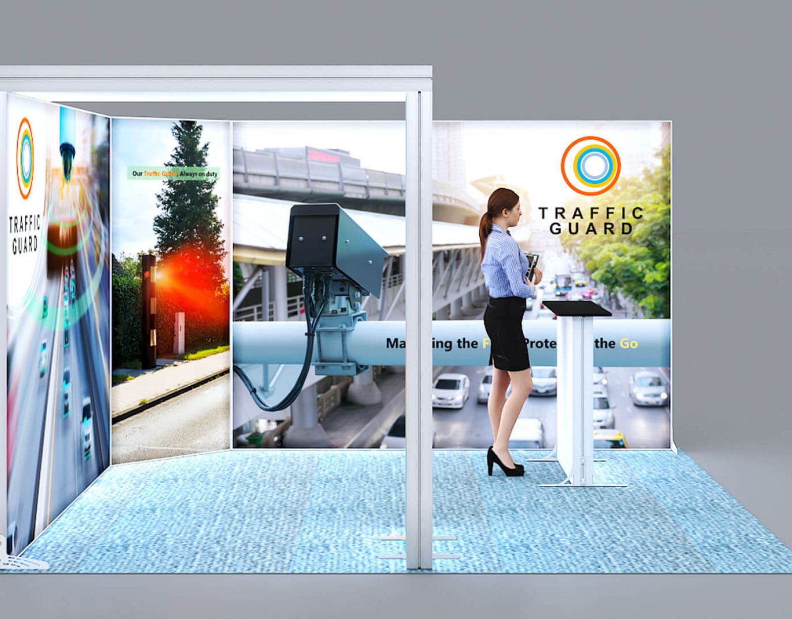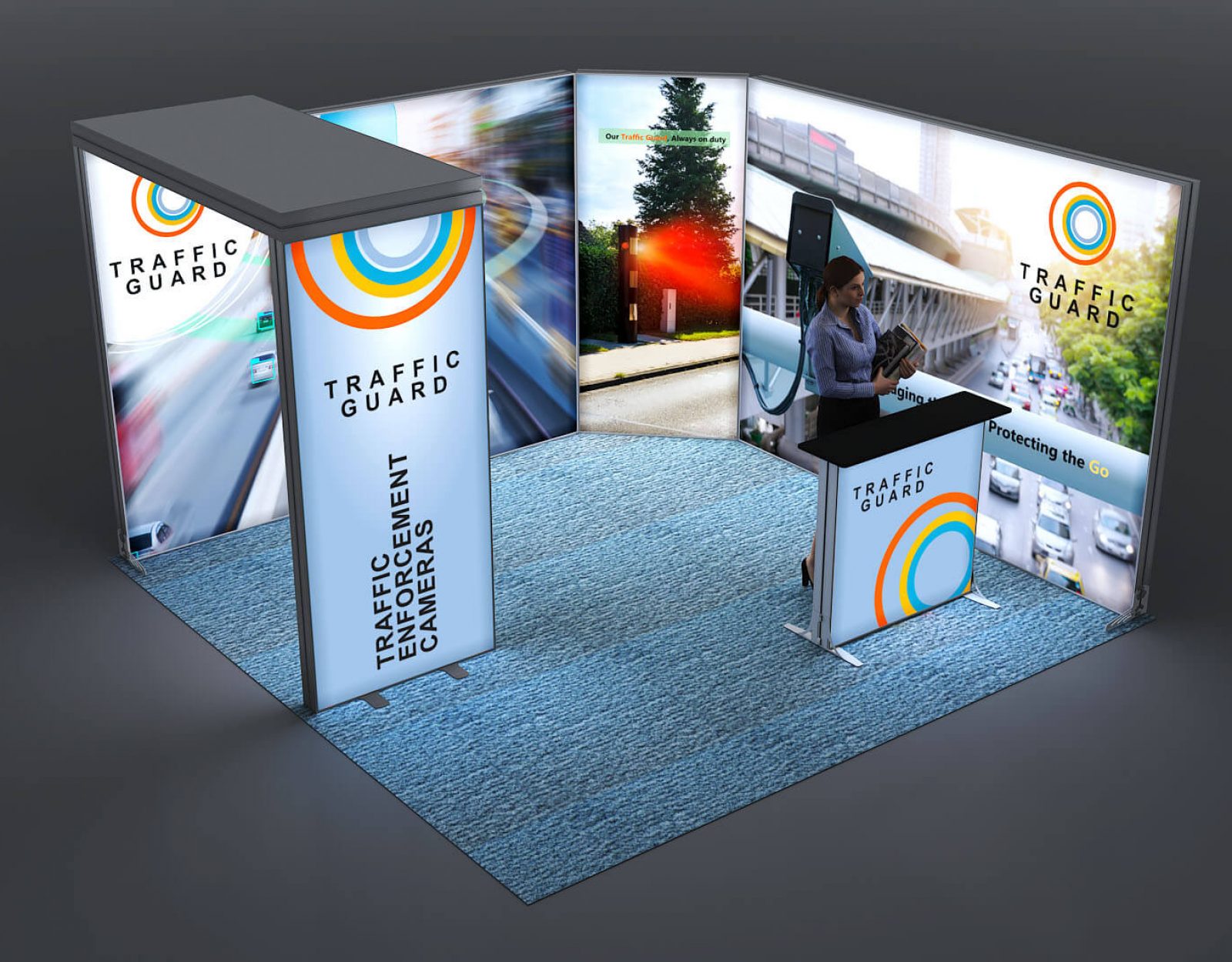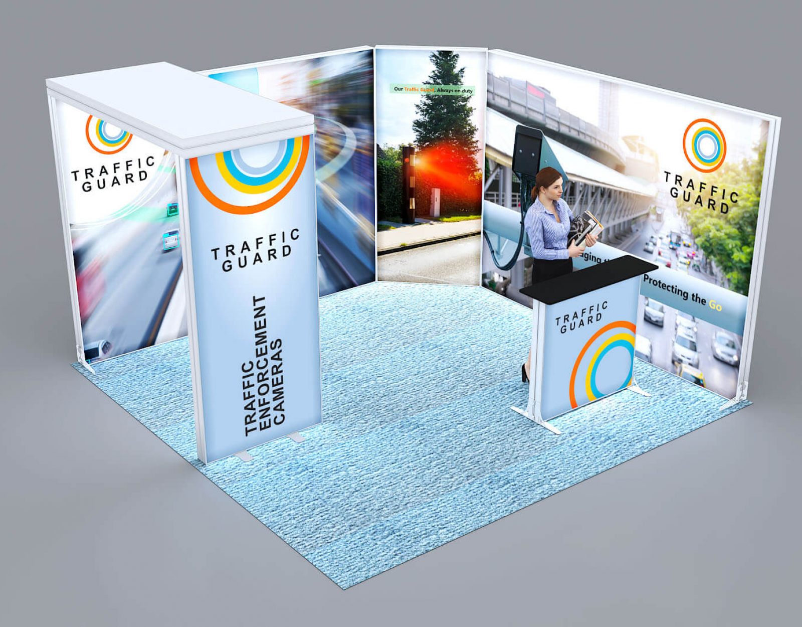 Modulares Messeset 12 4x4-01 LED Eckstand mit Brücke und Theke