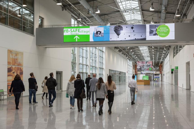 Um den 1,5-Meter-Abstand zu garantieren, werden die Besucher in den Gängen der Messe stärker "gelenkt". Die Gänge wurden zweigeteilt und eine Laufrichtung festgelegt. Es ist nicht erlaubt, in der Mitte des Ganges zu gehen, wodurch automatisch eine Distanz zwischen den Ausstellungsbesuchern entsteht. Verschiedene Farben der Bodenbeläge zeigen den Besuchern die Laufrichtung an. Die Gänge sind bei vielen Messen auch breiter als bisher.